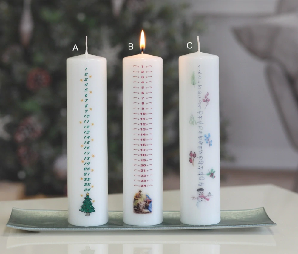Adventní svíce s kalendářem (24 adventních dnů) a vánočním motivem.